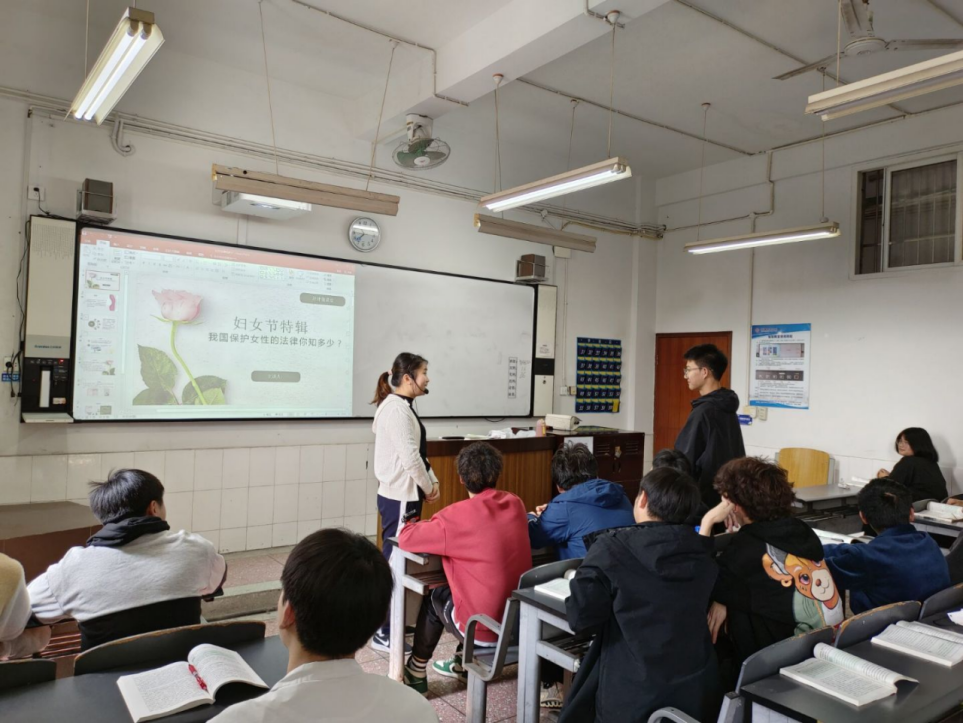 为宣传法律知识,引导广大学生学法、知法、用法、守法,切实提高依法维护自身权益的意识和能力,在第113个“三八”国际妇女节到来之际,马克思主义学院思想道德与法治课程教研室组织开展“三八”法律知识进课堂主题活动。