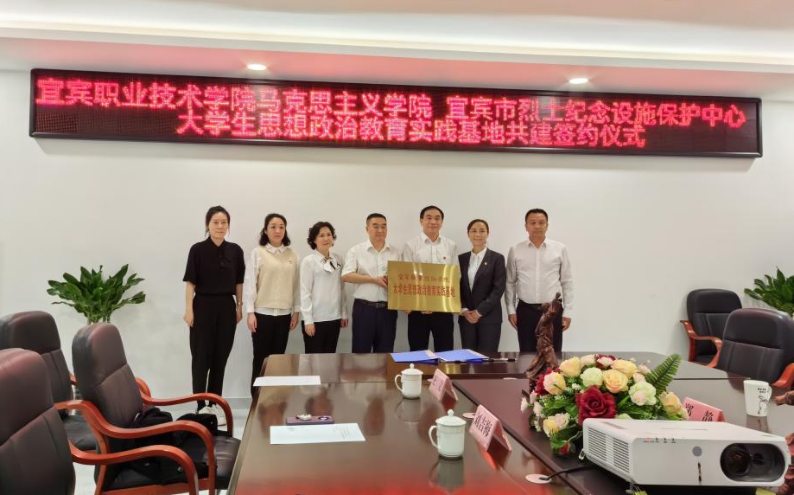 祭奠活动结束后,在烈士纪念设施保护中心二楼会议室举行了大学生思想政治教育实践基地共建签约仪式,宜宾职业技术学院党委常委、副院长江仁朝、宜宾市退役军人事务局党组成员、副局长朱训、宜宾市烈士纪念设施保护中心主任郑静、宜宾职业技术学院马克思主义学院院长兼党总支书记刘吉梅、宜宾职业技术学院团委副书记陈月出席签约仪式。