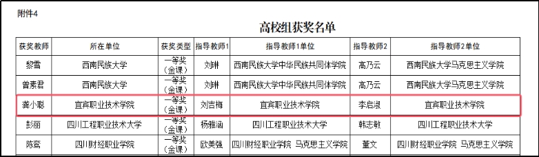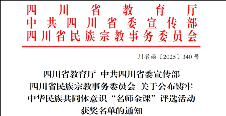 近日,四川省教育厅、中共四川省委宣传部、四川省民族宗教事务委员会联合公布四川省首届铸牢中华民族共同体意识“名师金课”评选结果。在本科院校与高职院校同台竞技的激烈角逐中,我院教师龚小聪凭借出色的教学设计和扎实的教学功底,荣获高校组一等奖(金课)。